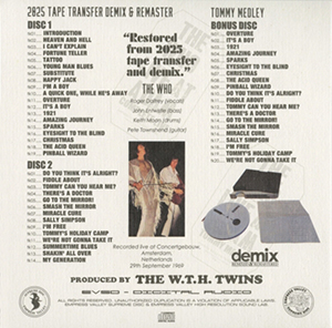 Track Listing: Heaven And Hell, Fortune Teller, Tattoo, I'm A Boy, Happy Jack, A Quick One While He's Away, My Generation, Shakin' All Over, MC, It's A Boy, 1921, Amazing Journey, Sparks, Eyesight To The Blind, Christmas, The Acid Queen, Pinball Wizard, Do You Think It's Alright, Fiddle About, There's A Doctor, Go To The Mirror, MC, Smash The Mirror, I'm Free, Tommy's Holiday Camp, We're Not Gonna Take It/See Me, Feel Me, Summertime Blues, MC, Magic Bus